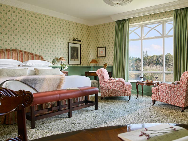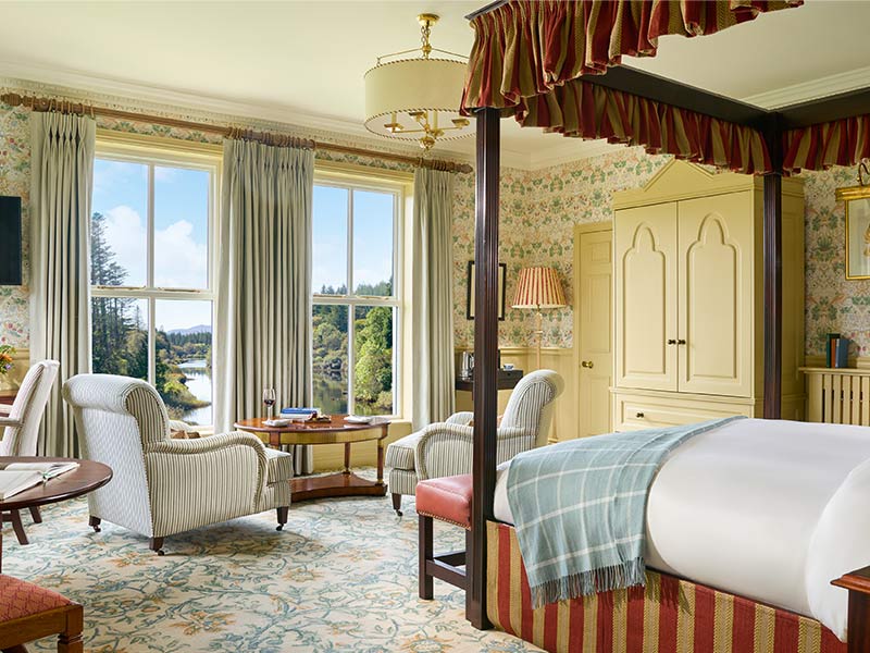 Nestled on the shores of the river for which the castle is named, Ballynahinch Castle exudes rustic elegance. This iconic Irish country house was built in 1754 and constructed on the same site of an older 16th-century castle. Interestingly, the older castle was once under the dominion of Grace O’Malley, Ireland’s infamous Pirate Queen.